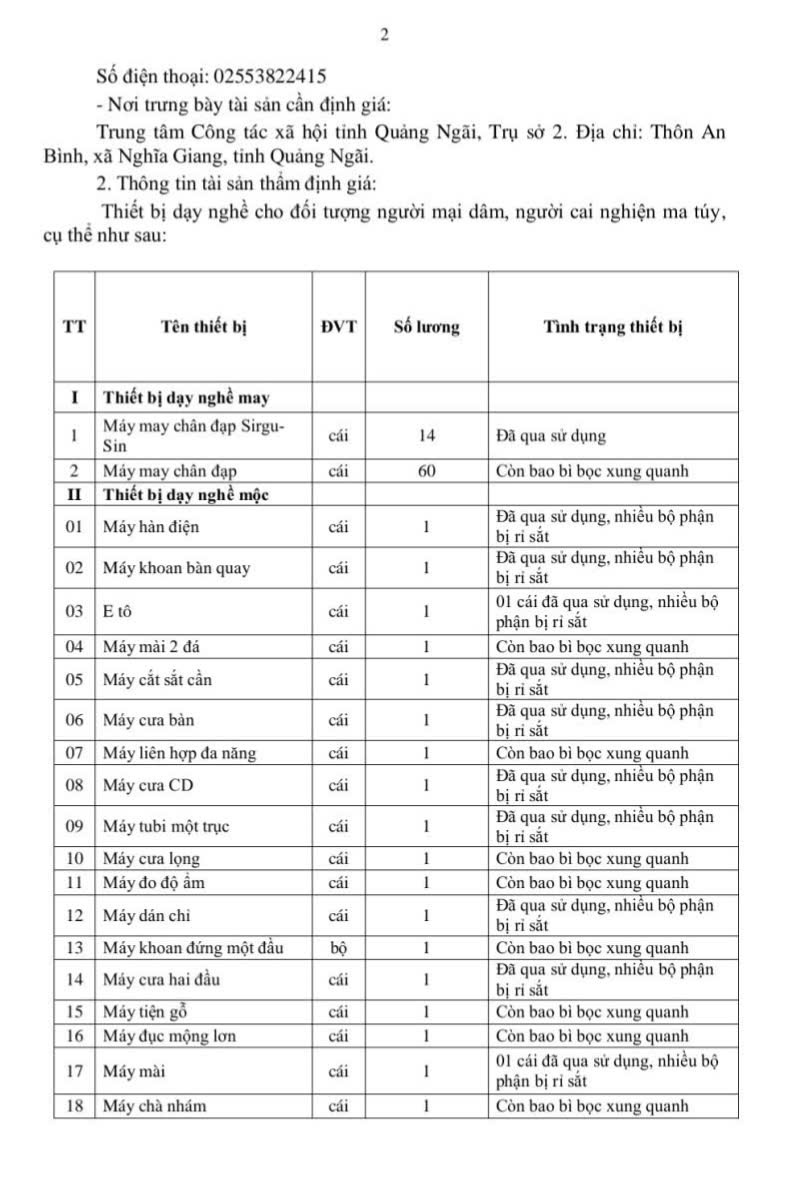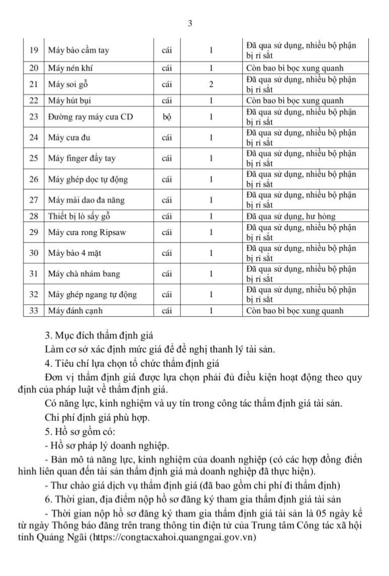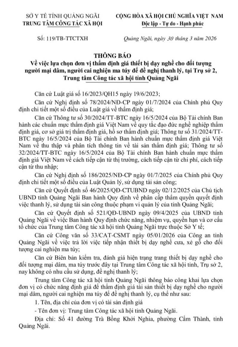 Trung tâm Công tác xã hội tỉnh Quảng Ngãi Thông báo lựa chọn đơn vị thẩm định giá thiết bị dạy nghề.