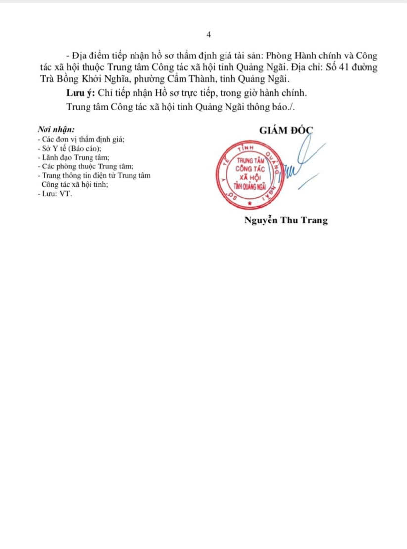 Thông báo về việc lựa chọn đơn vị, tổ chức đấu giá thanh lý 04 ngôi nhà của Trung tâm Công tác xã hội tỉnh Quảng Ngãi.